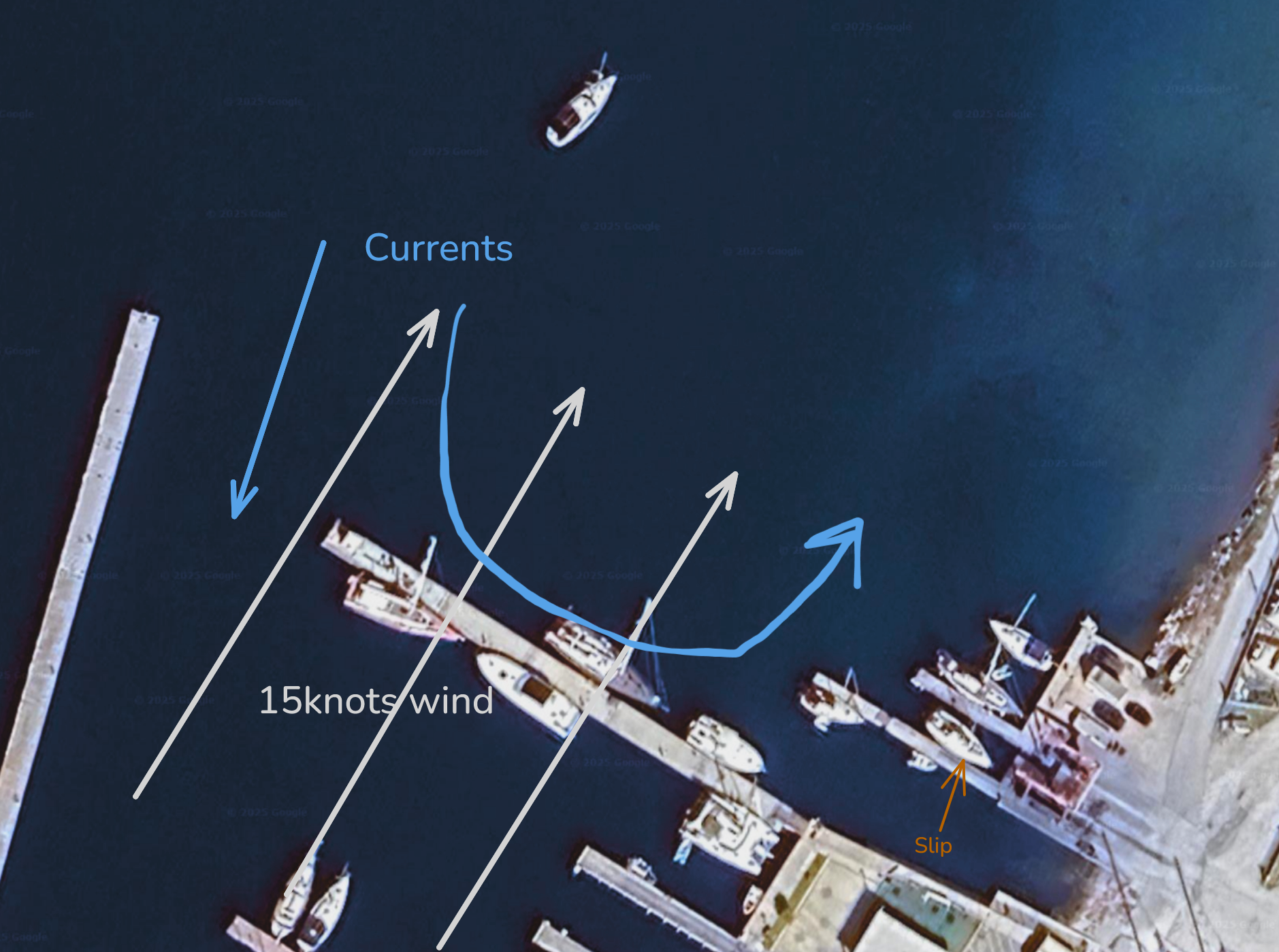 Then let's add in a challenge -- wind and currents. Trying to get into the slip where they would lift our boat out was one of the hardest maneuvers I did all year (and we did a lot of stern-to docking!). To illustrate what the currents and wind are doing: